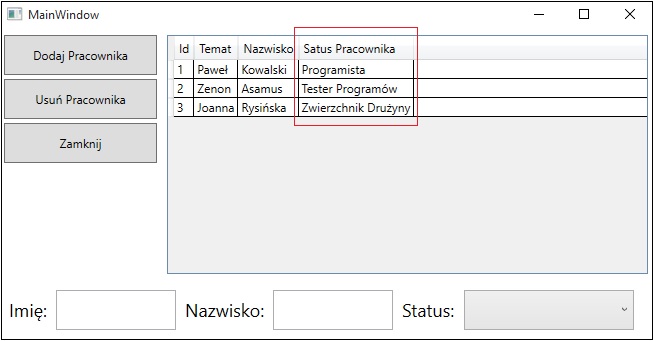 Jak widać kolumna Status Pracownika posiada wartości pobrane stricte z typu wyliczeniowego enum: